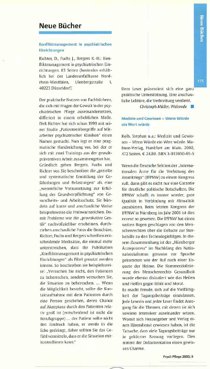 - Richter, D., Fuchs. J. M., Bergers, K. H.: Konfliktmanagement in psychiatrischen Einrichtungen. Prävention in NRW (1), Schriftenreihe der Rheinischen und Westfälischen Gemeindeunfallversicherungsverbände und der Landesunfallkasse NRW. Münster / Düsseldorf: Selbstverlag 2001 Rezension lesen